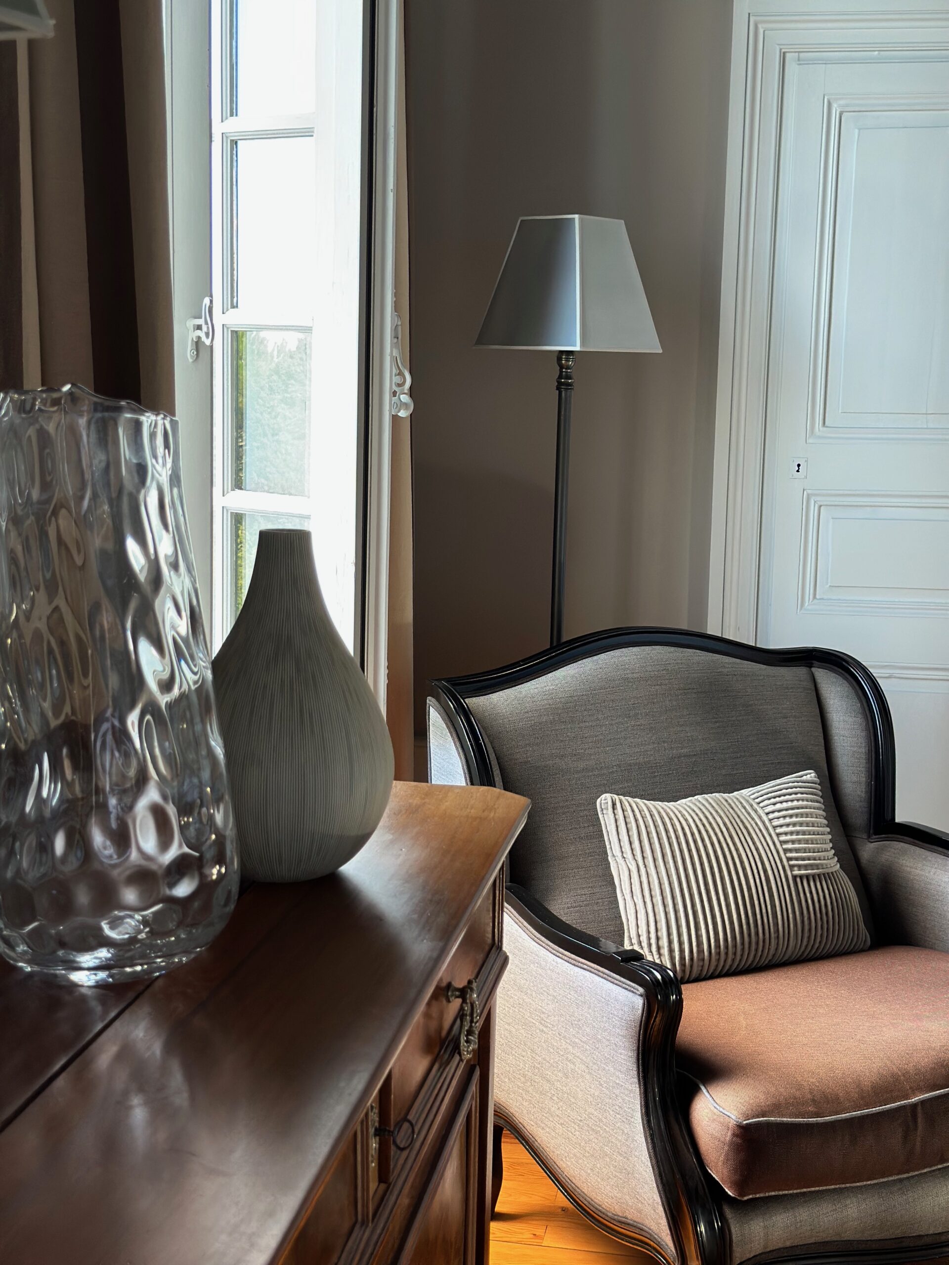 Deux hautes fenêtres s’ouvrent sur la plaine, offrant un panorama champêtre à couper le souffle, tandis que le mobilier de famille infuse à l’espace chaleur et douceur. Ici, chaque détail célèbre l’élégance et la tranquillité.